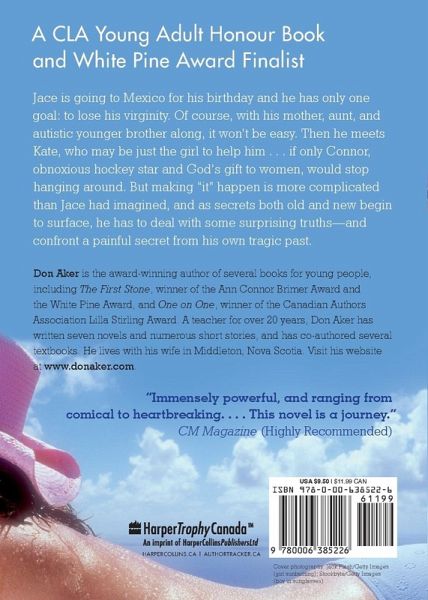 Just dumped by his girlfriend, Jace Antonakos has recorded a proclamation in a notebook his English teacher made him take on his winter vacation to the Mayan Riviera: I'm going to Mexico to get laid. The fact that he's only days away from turning 18 and still a virgin has Jace spooked, and he figures that Playa del Carmen's golden beaches draped with equally golden girls should increase his odds of success. On the other hand, the fact that he's travelling with his mother, his aunt and his nine-year-old autistic brother just about kills that bet. Then he meets Kate, who he thinks might be just the person to help him with his "problem." If only he knew what to say to her. Nothing new there-no one in his family has been talking much after what happened to his older brother, Stefan. Until now, the no-talking thing has been working for Jace, who has kept a secret from everyone-including himself-for nearly a year. Opening up to someone may be way more than he can handle. In a story that is by turns hilarious and heartbreaking, Don Aker once again captures an actual teenager, wrestles him to the page and compassionately reveals him as a character who is equally smart and stupid about sexuality, sex, telling the truth and hiding the lies. With his incredible high-wire talent for balancing sensitive subjects with sardonic, teen-friendly humour, Aker delivers another brilliant must- read novel.