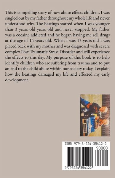 This is compelling story of how abuse effects children. I was singled out by my father throughout my whole life and never understood why. The beatings started when I was younger than 3 years old years old and never stopped. My father was a cocaine addicted and he began having me sell drugs at the age of 14 years old. When I was 15 years old I was placed back with my mother and was diagnosed with severe complex Post Traumatic Stress Disorder and still experience the effects to this day. My purpose of this book is to help identify children who are suffering from trauma and to put an end to the child abuse within our society today. I explain how the beatings damaged my life and effected my early development. I hope this book can guide men to be better fathers and refrain from hurting innocent children. Thank you for your interest and I know you will enjoy!