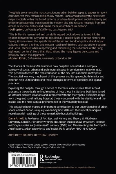 The Spaces of the Hospital examines how hospitals operated as a complex category of social, urban and architectural space in London from 1680 to 1820. This period witnessed the transformation of the city into a modern metropolis. The hospital was very much part of this process and its spaces, both interior and exterior, help us to understand these changes in terms of spatiality and spatial practices. Exploring the hospital through a series of thematic case studies, Dana Arnold presents a theoretically refined reading of how these institutions both functioned as internal discrete locations and interacted with the metropolis. Examples range from the grand royal military hospital, those concerned with the destitute and the insane and the new cultural phenomenon of the voluntary hospital. ¿ This engaging book makes an important contribution to our understanding of urban space and of London, uniquely examining how different theoretical paradigms reveal parallel readings of these remarkable hospital buildings.