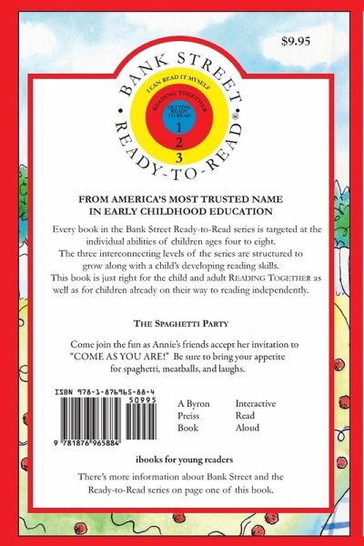 Come join the fun as Annie's friends accept her invitation to "COME AS YOU ARE!" Be sure to bring your appetite for spaghetti, meatballs, and laughs. More than seventy years of educational research and innovative teaching have given the Bank Street College of Education the reputation as America's most trusted name in early childhood education. Because no two children are exactly alike in their development, we have designed the Bank Street Ready-to-Read series in three levels to accommodate the individual stages of reading readiness of children ages four through eight. • Level 1: GETTING READY TO READ- (PRE-K to GRADE 1) Books are perfect for reading aloud with children who are getting ready to read or are just beginning to read words or phrases. • Level 2: READING TOGETHER-(GRADES 1 to 3) Books are written especiallly for children who are on their way to reading independently but who may need help. • Level 3: I CAN READ IT MYSELF-(GRADES 2 to 3) Books are designed for children able to read on their own. They also can be enjoyed as read-alouds.