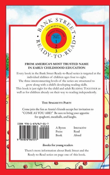 Come join the fun as Annie's friends accept her invitation to "COME AS YOU ARE!" Be sure to bring your appetite for spaghetti, meatballs, and laughs. ¿FROM AMERICA'S MOST TRUSTED NAME IN EARLY CHILDHOOD EDUCATION More than seventy years of educational research and innovative teaching have given the Bank Street College of Education the reputation as America's most trusted name in early childhood education. Because no two children are exactly alike in their development, we have designed the Bank Street Ready-to-Read series in three levels to accommodate the individual stages of reading readiness of children ages four through eight. • Level 1: GETTING READY TO READ- (PRE-K to GRADE 1) Books are perfect for reading aloud with children who are getting ready to read or are just beginning to read words or phrases. • Level 2: READING TOGETHER-(GRADES 1 to 3) Books are written especiallly for children who are on their way to reading independently but who may need help. • Level 3: I CAN READ IT MYSELF-(GRADES 2 to 3) Books are designed for children able to read on their own. They also can be enjoyed as read-alouds.