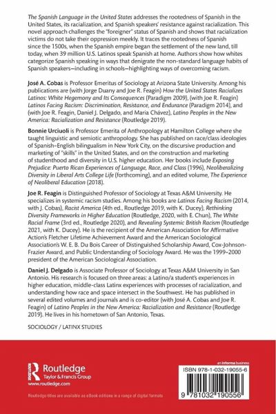 José A. Cobas is Professor Emeritus of Sociology at Arizona State University. Among his publications are (with Jorge Duany and Joe R. Feagin) How the United States Racializes Latinos: White Hegemony and Its Consequences (Paradigm 2009), (with Joe R. Feagin) Latinos Facing Racism: Discrimination, Resistance, and Endurance (Paradigm 2014), and (with Joe R. Feagin, Daniel J. Delgado, and Maria Chávez), Latino Peoples in the New America: Racialization and Resistance (Routledge 2019). Bonnie Urciuoli is Professor Emerita of Anthropology at Hamilton College where she taught linguistic and semiotic anthropology. She has published on race/class ideologies of Spanish-English bilingualism in New York City, on the discursive production and marketing of "skills" in the United States, and on the construction and marketing of studenthood and diversity in U.S. higher education. Her books include Exposing Prejudice: Puerto Rican Experiences of Language, Race, and Class (1996), Neoliberalizing Diversity in Liberal Arts College Life (forthcoming), and an edited volume, The Experience of Neoliberal Education (2018). Joe R. Feagin is Distinguished Professor of Sociology at Texas A&M University. He specializes in systemic racism studies. Among his books are Latinos Facing Racism (2014, with J. Cobas), Racist America (4th ed., Routledge 2019, with K. Ducey), Rethinking Diversity Frameworks in Higher Education (Routledge, 2020, with E. Chun), The White Racial Frame (3rd ed., Routledge 2020), and Revealing Systemic British Racism (Routledge 2021, with K. Ducey). He is the recipient of the American Association for Affirmative Action's Fletcher Lifetime Achievement Award and the American Sociological Association's W. E. B. Du Bois Career of Distinguished Scholarship Award, Cox-Johnson- Frazier Award, and Public Understanding of Sociology Award. He was the 1999-2000 president of the American Sociological Association. Daniel J. Delgado is Associate Professor of Sociology or at Texas A&M University in San Antonio. His research is focused on three areas: a Latino/a student's experiences in higher education, middle-class Latinx experiences with processes of racialization, and understanding how race and space intersect in the Southwest. He has published in several edited volumes and journals and is co-editor (with José A. Cobas and Joe R. Feagin) of Latino Peoples in the New America: Racialization and Resistance (Routledge 2019). He lives in his hometown of San Antonio, Texas.