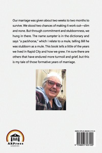 Our marriage was given about two weeks to two months to survive. We stood two chances of making it work out-slim and none. But through commitment and stubbornness, we hung in there. The name sumpter is in the dictionary and says "a packhorse," which I relate to a mule, telling Bill he was stubborn as mule. This book tells a little of the years we live in Rapid City and how we grew. I'm sure there are others that have endured more turmoil and grief, but this is my tale of those formative years of marriage.