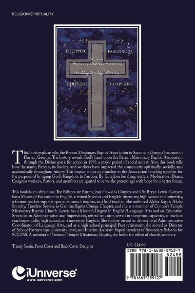 This book explains why the Berean Missionary Baptist Association in Savannah, Georgia has roots in Darien, Georgia. The history reveals God's hand upon the Berean Missionary Baptist Association through the Divine spark for action in 1899, a major period of social unrest. Also, this book tells how the name, Berean, its leaders, and workers have impacted the community spiritually, socially, and academically throughout history. This impact is due to churches in the Association bonding together for the purpose of bringing God's Kingdom to fruition. By Kingdom building, readers, Moderators, Deans, Congress workers, Pastors, and members are ignited to serve the present age with hope for a better future. This book is an edited one. The Editors are Emma Jean Hawkins Conyers and Ola Bryan Lewis. Conyers has a Master of Education in English, a retired Spanish and English Instructor, high school and university, a former teacher support specialist, search teacher, and lead teacher. She authored Alpha Kappa Alpha Sorority, Timeless Service in Gamma Sigma Omega Chapter, and she is a member of Connor's Temple Missionary Baptist Church. Lewis has a Master's Degree in English/Language Arts and an Education Specialist in Administration and Supervision, retired educator, served numerous capacities, to include teaching middle, high school, and university English. She further served as district level Administrative Coordinator, of Language Arts, and as a high school principal. Post retirement, she served as Director of School Partnerships, university level, and Interim Assistant Superintendent of Secondary Schools for SCCPSS. A member of Tremont Temple Missionary Baptist, she holds the office of church secretary.