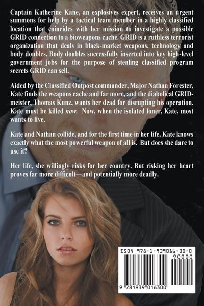 S.A.S.S. A covert unit of Security Specialists tasked with bringing down GRID, an international organization of black-market brokers of intelligence, weaponry systems, and technology run by the diabolical Thomas Kunz, who will do anything to anyone anywhere to destroy America. Captain Katherine Kane, an explosives expert, receives an urgent summons for help by a tactical team member in a highly classified location that coincides with her mission to investigate a possible GRID connection to a bioweapons cache. GRID is a ruthless terrorist organization that deals in black-market weapons, technology and body doubles. Body doubles successfully inserted into key high-level government jobs for the purpose of stealing classified program secrets GRID can sell. Aided by the Classified Outpost commander, Major Nathan Forester, Kate finds the weapons cache and far more, and the diabolical GRID-meister, Thomas Kunz, wants her dead for disrupting his operation. Kate must be killed now. Now, when the isolated loner, Kate, most wants to live. Kate and Nathan collide, and for the first time in her life, Kate knows exactly what the most powerful weapon of all is. But does she dare to use it? Her life, she willingly risks for her country. But risking her heart proves far more difficult--and potentially more deadly.