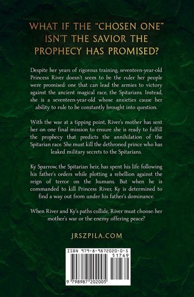 What if the "chosen one" isn't the savior the prophecy has promised? Despite her years of rigorous training, seventeen-year-old Princess River doesn't seem to be the ruler her people were promised: one that can lead the armies to victory against the ancient magical race, the Spitarians. Instead, her anxieties cause her ability to rule to be constantly brought into question. With the war at a tipping point, River's mother has sent her on one final mission to ensure she is ready to fulfill the prophecy that predicts the annihilation of the Spitarian race. She must kill the dethroned prince who has leaked military secrets to the Spitarians. Ky Sparrow, the Spitarian heir, has spent his life following his father's orders while plotting a rebellion against the reign of terror on the humans. But when he is commanded to kill Princess River, Ky is determined to find a way out from under his father's dominance. When River and Ky's paths collide River must choose: her mother's war or the enemy offering peace?