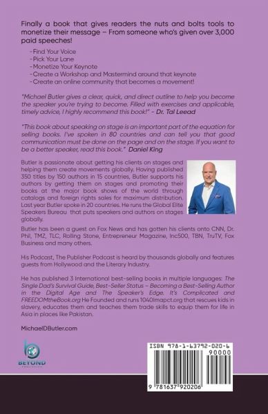 Finally a book that gives readers the nuts and bolts tools to monetize their message - From someone who's given over 3,000 paid speeches! - Find Your Voice - Pick Your Lane - Monetize Your Keynote - Create a Workshop and Mastermind around that keynote - Create an online community that becomes a movement!