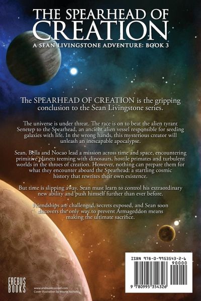 It has roamed the universe for billions of years, sowing barren worlds with life. This incredible force is about to be turned against us. The universe is under threat. The race is on to beat the alien tyrant Senetep to the Spearhead, an ancient alien vessel responsible for seeding galaxies with life. In the wrong hands, this mysterious creator will unleash an inescapable apocalypse. Sean, Bella and Nocao lead a mission across time and space, encountering primitive planets teeming with dinosaurs, hostile primates and turbulent worlds in the throes of creation. But nothing can prepare them for what they encounter aboard the Spearhead: a startling cosmic history that rewrites their own existence. But time is slipping away. Sean must learn to control his extraordinary new ability and push himself further than ever before. Friendships are challenged, secrets exposed, and Sean soon discovers the only way to prevent Armageddon means making the ultimate sacrifice. The Spearhead of Creation is the thrilling conclusion to the Sean Livingstone Adventure Series.