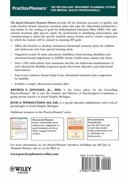 PracticePlanners(R) The Bestselling treatment planning system for mental health professionals The Special Education Treatment Planner provides all the elements necessary to quickly and easily develop formal education treatment plans that take the educational professional a step further past the writing of goals for Individualized Education Plans (IEPs). The educational treatment plan process assists the professional in identifying interventions and communicating to others the specific method, means, format, and/or creative experience by which the student will be assisted in attaining IEP goals. * Offers the freedom to develop customized educational treatment plans for children and adolescents who have special learning needs * Organized around 29 main educational disabilities, from learning disabilities and emotional/mental impairment to ADHD, chronic health issues, autism, and others * Over 1,000 well-crafted, clear statements describe the behavioral manifestations of each educational disability, long-term goals, short-term objectives, and educational interventions * Easy-to-use reference format helps locate educational treatment plan components by disability * Includes a sample educational treatment plan Additional resources in the PracticePlanners(R) series: Homework Planners feature behaviorally based, ready-to-use assignments to speed treatment and keep clients engaged between sessions. Documentation Sourcebooks provide the forms and records that mental health professionals need to efficiently run their practice. For more information on our PracticePlanners(R) products, including our full line of Treatment Planners, visit us on the Web at: www.practiceplanners.wiley.com