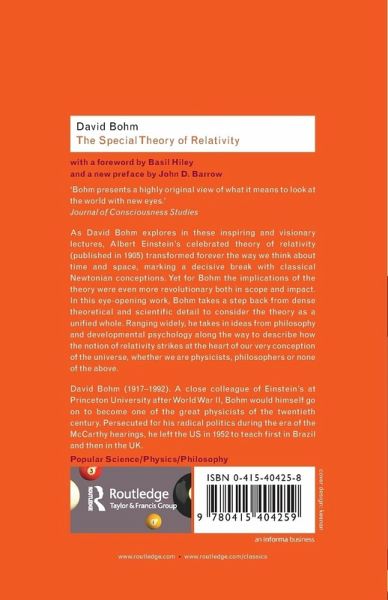 In these inspiring lectures David Bohm explores Albert Einstein's celebrated Theory of Relativity that transformed forever the way we think about time and space. Yet for Bohm the implications of the theory were far more revolutionary both in scope and impact even than this. Stepping back from dense theoretical and scientific detail in this eye-opening work, Bohm describes how the notion of relativity strikes at the heart of our very conception of the universe, regardless of whether we are physicists or philosophers.