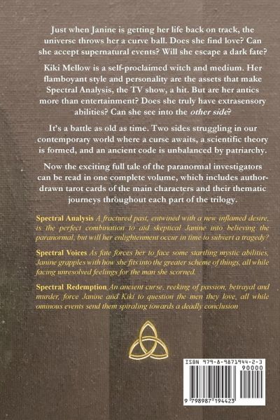 Just when Janine is getting her life back on track, the universe throws her a curve ball. Does she find love? Can she accept supernatural events? Will she escape a dark fate? Kiki Mellow is a self-proclaimed witch and medium. Her flamboyant style and personality are the assets that make Spectral Analysis, the TV show, a hit. But are her antics more than entertainment? Does she truly have extrasensory abilities? Can she see into the other side? It's a battle as old as time. Two sides struggling in our contemporary world where a curse awaits, a scientific theory is formed, and an ancient code is unbalanced by patriarchy. Now the exciting full tale of the paranormal investigators can be read in one complete volume, which includes author-drawn tarot cards of the main characters and their thematic journeys throughout each part of the trilogy.