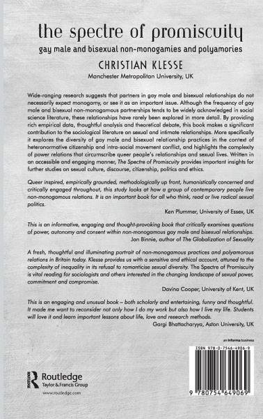 Wide-ranging research suggests that partners in gay male and bisexual relationships do not necessarily expect monogamy, or see it as an important issue. Although the frequency of gay male and bisexual non-monogamous partnerships tends to be widely acknowledged in social science literature, these relationships have rarely been explored in more detail. By providing rich empirical data, thoughtful analysis and theoretical debate, this book makes a significant contribution to the sociological literature on sexual and intimate relationships. More specifically it explores the diversity of gay male and bisexual relationship practices in the context of heteronormative citizenship and intra-social movement conflict, and highlights the complexity of power relations that circumscribe queer people's relationships and sexual lives. Written in an accessible and engaging manner, The Spectre of Promiscuity provides important insights for further studies on sexual culture, discourse, citizenship, politics and ethics.