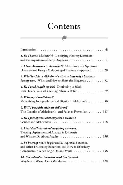 Introduction Chapter 1: Do I have Alzheimer's? Identifying Memory Disorders and the Importance of Early Diagnosis Chapter 2: I have Alzheimer's. Now what? Alzheimer's as a Spectrum Disease - and Using a Multipronged Treatment Approach Chapter 3: Whether I have Alzheimer's disease is nobody's business but my own. When and How to Share the Diagnosis. Chapter 4: Do I need to quit my job? Continuing to Work with Dementia - and Knowing When to Retire Chapter 5: Who says I can't drive? Maintaining Independence and Dignity in Alzheimer's Chapter 6: Will I pass this on to my children? The Genetics of Alzheimer's - and Paths to Prevention Chapter 7: Do I feel special challenges as a woman? Gender and Alzheimer's Chapter 8: I just don't care about anything anymore. Treating Depression and Anxiety in Dementia and What to Do About Apathy Chapter 9: I'd be crazy not to be paranoid! Apraxis, Paranoia, and Other Frustrating Behaviors and How to Effectively Communicate When Logic Doesn't Work Chapter 10: I'm not lost - I'm on the road less traveled. Why Not to Worry About Wandering Chapter 11: I can't take it anymore! Advice to Caregivers: Self-Care, Stress Reduction, and When to Seek Additional Help Chapter 12: I think my husband is cheating on me. Navigating Sexuality, Suspicion, Affairs, and Special Arrangements Chapter 13: Should I go to the hospital if I'm sick? Treating Medical Illness Alongside Dementia Chapter 14: Whether you like it or not, here's what I want. Maintaining Individuality in the Face of Alzheimer's Chapter 15: I would rather die at home. Living and Dying with Dignity - in the Comfort of Home Chapter 16: Gee, that must be depressing! My Life as a Physician Specializing in Alzheimer's - Trials, Rewards, and Lessons Learned