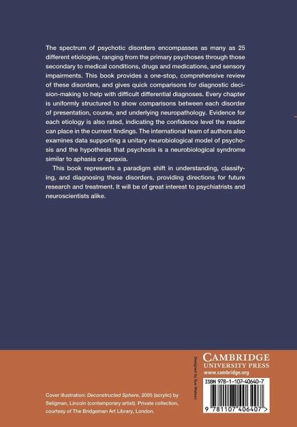 The spectrum of psychotic disorders encompasses as many as 25 different etiologies, ranging from the primary psychoses through those secondary to medical conditions, drugs and medications, and sensory impairments. This book provides a one-stop, comprehensive review of these disorders and gives quick comparisons for diagnostic decision-making to help with difficult differential diagnoses. Every chapter is uniformly structured to show comparisons between each disorder of presentation, course, and underlying neuropathology. Evidence for each etiology is also rated, indicating the confidence level the reader can place in the current findings. The international team of authors also examines data supporting a unitary neurobiological model of psychosis and the hypothesis that psychosis is a neurobiological syndrome similar to aphasia or apraxia. This book represents a paradigm shift in understanding, classifying and diagnosing these disorders, providing directions for future research and treatment. It will be of great interest to psychiatrists and neuroscientists alike.