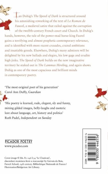 "Speed of Dark "is structured around his astonishing reworking of the text of "Le Roman de Fauvel," a medieval text that railed against the corruption of the 12th-century French court and church. In Ian Duhig's hands, however, the tale of the power-mad horse-king Fauvel gains a terrifying and almost prophetic contemporary relevance, and is identified with more recent crusades, crazed ambitions, and insatiable greed. Elsewhere Duhig's many admirers will be delighted by his new ballads and elegies, his erudite high jinks, and his low gags--with which he builds on the new imaginative territory he staked out in "The Lammas Hireling" to such universal acclaim. This collection again shows Duhig as one the most capacious and brilliant minds in contemporary poetry