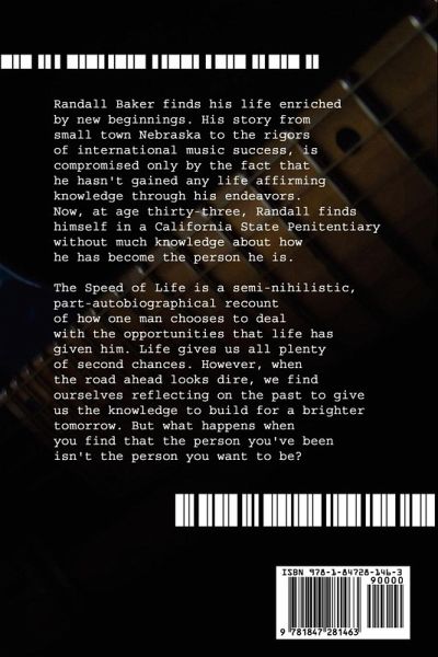 Randall Baker finds his life enriched by new beginnings. His story from small town Nebraska to the rigors of international music success is compromised only by the fact that he hasn't gained any life affirming knowledge through his endeavors. Now, at age thirty-three, Randall finds himself in a California State Penitentiary without much knowledge about how he has become the person he is. The Speed of Life is a semi-nihilistic, part-autobiographical recount of how one man chooses to deal with the opportunities that life has given him. Life gives us all plenty of second chances. However, when the road ahead looks dire, we find ourselves reflecting on the past to give us the knowledge to build for a brighter tomorrow. But what happens when you find that the person you've been isn't the person you want to be?