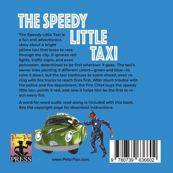 The Speedy Little Taxi is a fun and adventurous story about a bright yellow taxi that loves to race through the city. It ignores red lights, traffic signs, and even policemen, determined to be first wherever it goes. The taxi's owner tries painting it different colors-green and blue-to calm it down, but the taxi continues to zoom ahead, even racing with fire trucks to reach fires first. After much trouble with the police and fire department, the Fire Chief buys the speedy little taxi, paints it red, and now it helps him be the first to reach every fire. A word-for-word audio read-along is included with this book. See the inside cover for instructions.