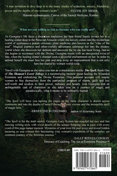 As Georgina's life faces a disastrous implosion her best friend Sandy invites her to a healing center deep in the Peruvian Amazon where she naively enters into the mysterious world of ayahuasca-a potent visionary plant medicine also known as the "vine of the soul". Magical journeys and other-worldly adventures submerge her into the shadow world where she discovers her demons and uncovers the lie she has been living. Just as she begins to reconnect with the Divine, Georgina meets with an unexpected twist of fate, when the healing center's shaman casts a powerful enchantment on her. In order to unbind herself she must face her past and strip away an imprisonment that is not only hers but shared by women world-wide. Travel with Georgina as she takes you into an extraordinary reality. The Spell, Book One of The Shaman's Lover Trilogy is a mesmerizing memoir about healing the Wounded Feminine and embodying the Divine Feminine. This personal account will inspire women to free themselves from the patriarchal program of shame, guilt and low self-worth and awaken to their power, radiance and beauty. Join Georgina and an unforgettable cast of characters as she takes you on a journey of magic and paradoxically, what it means to be ordinarily human.