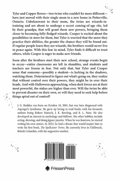 J. G. Hadden was born on October 18, 2001, but was later diagnosed with Asperger's Syndrome. He grew up loving to read books with his favourite authors being Robert Munsch, J. K. Rowling, and R. L. Stine. He also developed an interest in mythology and folklore. His other hobbies include acting, drawing, and doing jigsaw puzzles. When he was fourteen, he started writing his own stories. In 2022, he had a dream that would inspire him to write his first book, The Spellcaster Twins. He currently lives in Chilliwack, British Columbia, with his supportive mother.
