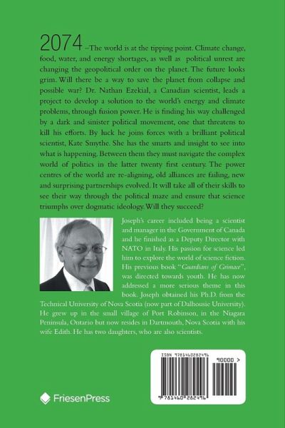 2074 -The world is at the tipping point. Climate change, food, water, and energy shortages, as well as political unrest are changing the geopolitical order on the planet. The future looks grim. Will there be a way to save the planet from collapse and possible war? Dr. Nathan Ezekial, a Canadian scientist, leads a project to develop a solution to the world's energy and climate problems, through fusion power. He is finding his way challenged by a dark and sinister political movement, one that threatens to kill his efforts. By luck he joins forces with a brilliant political scientist, Kate Smythe. She has the smarts and insight to see into what is happening. Between them they must navigate the complex world of politics in the latter twenty first century. The power centres of the world are re-aligning, old alliances are failing, new and surprising partnerships evolved. It will take all of their skills to see their way through the political maze and ensure that science triumphs over dogmatic ideology. Will they succeed?