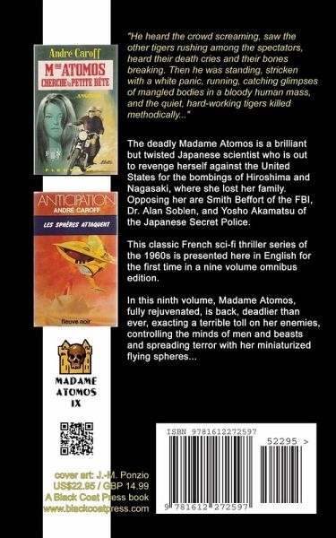 The deadly Madame Atomos is a brilliant but twisted Japanese scientist who is out to avenge herself against the United States for the bombings of Hiroshima and Nagasaki, where she lost her family. Opposing her are Smith Beffort of the FBI, Dr. Alan Soblen, and Yosho Akamatsu of the Japanese Secret Police. This classic French sci-fi thriller series from the 1960s is presented here in English for the first time in a nine-volume omnibus edition, of which this is the last. Here, the sinister Madame Atomos, now fully rejuvenated, is back, deadlier than ever, controlling the minds of men and beasts, and spreading terror with her new miniaturized spheres.