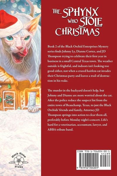 Book 2 of the Black Orchid Enterprises Mystery series finds Johnny Ly, Dianne Cortez, and JD Thompson trying to celebrate their first year in business in a small Central Texas town. The weather outside is frightful, and indoors isn't looking too good either, not when a crazed hairless cat invades their Christmas party and leaves a trail of destruction in his wake. The murder in the backyard doesn't help, but Johnny and Dianne are more worried about the cat. After the police reduce the suspect list from the entire town of Beauchamp, Texas, to just the Black Orchids' friends and family, Attorney JD Thompson springs into action to clear them all, preferably before Monday night's concert. Life's hard for a veterinarian, accountant, lawyer, and ABBA tribute band.
