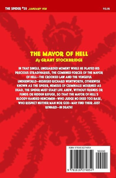 In that single, unguarded moment while he played his precious Stradivarius, the combined forces of the Mayor of Hell-the crooked Law and the vengeful Underworld-besieged Richard Wentworth, otherwise known as the Spider, nemesis of criminals! Mourned as dead, the Spider must start life anew, without friends or funds or hidden refuge, so that the Mayor of Hell's bloody-handed henchmen-who judge no deed too base, who respect neither man nor God-may find their just reward-in death!