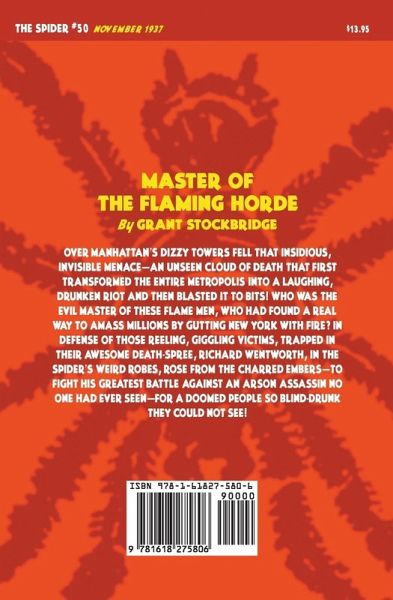 Over Manhattan's dizzy towers fell that insidious, invisible menace-an unseen cloud of death that first transformed the entire metropolis into a laughing, drunken riot and then blasted it to bits! Who was the evil Master of these Flame Men, who had found a real way to amass millions by gutting New York with fire? In defense of those reeling, giggling victims, trapped in their awesome death-spree, Richard Wentworth, in the Spider's weird robes, rose from the charred embers-to fight his greatest battle against an arson assassin no one had ever seen-for a doomed people so blind-drunk they could not see!