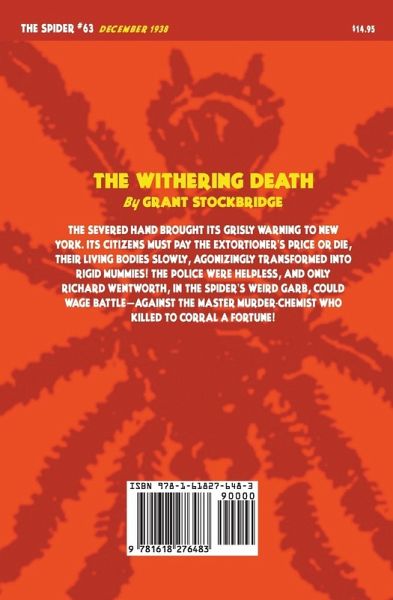 Sere, ghastly, the Severed Hand brought its grisly warning to New York. Its citizens must pay the extortioner's price or die, their living bodies slowly, agonizingly transformed into rigid mummies! The police were helpless, and only Richard Wentworth, in the Spider's weird garb, could wage battle-against the master murder-chemist who killed to corral a fortune!