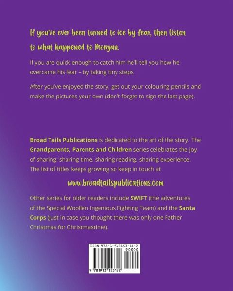 If you've you ever been turned to ice by fear, then listen to what happened to Morgan. If you are quick enough to catch him he'll tell you how he overcame his fear - by taking tiny steps. After you've enjoyed the story, get out your colouring pencils and make the pictures your own (don't forget to sign the last page). Broad Tails Publications is dedicated to the art of the story. The Grandparents, Parents and Children series celebrates the joy of sharing: sharing time, sharing reading, sharing experience. The list of titles keeps growing so keep in touch at www.broadtailspublications.com. Other series for older readers include SWIFT (the adventures of the Special Woollen Ingenious Fighting Team) and the Santa Corps (just in case you thought there was only one Father Christmas for Christmastime).