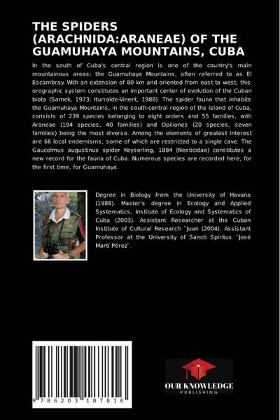 In the south of Cuba's central region is one of the country's main mountainous areas: the Guamuhaya Mountains, often referred to as El Escambray. With an extension of 80 km and oriented from east to west, this orographic system constitutes an important center of evolution of the Cuban biota (Samek, 1973; Iturralde-Vinent, 1988). The spider fauna that inhabits the Guamuhaya Mountains, in the south-central region of the island of Cuba, consists of 239 species belonging to eight orders and 55 families, with Araneae (194 species, 40 families) and Opiliones (20 species, seven families) being the most diverse. Among the elements of greatest interest are 66 local endemisms, some of which are restricted to a single cave. The Gaucelmus augustinus spider Keyserling, 1884 (Nesticidae) constitutes a new record for the fauna of Cuba. Numerous species are recorded here, for the first time, for Guamuhaya.
