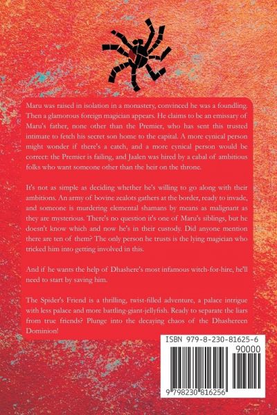 Last week, he didn't know he had a family. Now he's trying to save the world from them. Maru was raised in isolation in a monastery, convinced he was a foundling. Then a glamorous foreign magician appears. He claims to be an emissary of Maru's father, none other than the Premier, who has sent this trusted intimate to fetch his secret son home to the capital. A more cynical person might wonder if there's a catch, and a more cynical person would be correct: the Premier is failing, and Jaalen was hired by a cabal of ambitious folks who want someone other than the heir on the throne. It's not as simple as deciding whether he's willing to go along with their ambitions. An army of bovine zealots gathers at the border, ready to invade, and someone is murdering elemental shamans by means as malignant as they are mysterious. There's no question it's one of Maru's siblings, but he doesn't know which and now he's in their custody. Did anyone mention there are ten of them? The only person he trusts is the lying magician who tricked him into getting involved. And if he wants the help of Dhashere's most infamous witch-for-hire, he'll need to start by saving him. The Spider's Friend is a thrilling, twist-filled adventure, a palace intrigue with less palace and more battling-giant-jellyfish. A must-read for anyone interested in novel second worlds, it has mole-people and a city made of waterfalls; one of the narrative characters is a plant. Ready to separate the liars from true friends? Plunge into the decaying chaos of the Dhashereen Dominion!