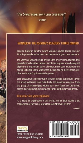 Kristine Kathryn Rusch's novel Diving into the Wreck spawned a universe so vast that one novel can't contain it. The Spires of Denon doesn't involve Boss or her crew. Instead, this powerful novella follows Meklos Verr, hired to guard an archeological dig near the mysterious Spires of Denon. There Verr encounters the prickly Gabrielle Reese who heads the dig, and he meets some cave divers who aren't quite what they seem. Verr knows that someone wants to harm the dig, but he isn't sure if the attack will come from outside the tall mountain range or from the group of archeologists within. Verr must figure out the threat before it destroys him, his crew, and the beautiful Spires of Denon. Praise for The Spires of Denon: "...a story of exploration of an artifact on an alien world, a bit reminiscent of the sort of story that Jack McDevitt writes." -Eyrie "...Denon is literally luminescent in its depiction." -Suite101 "The Spires makes for a very good read." -SFRevu