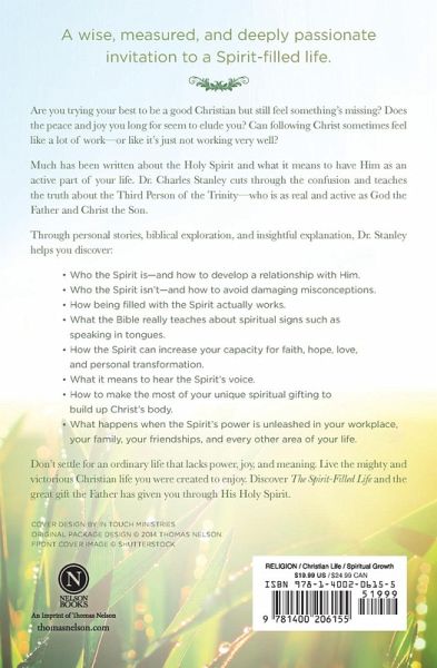 A wise, measured, and deeply passionate invitation to a Spirit-filled life Are you trying your best to be a good Christian but still feel something’s missing? Do the peace and joy you long for seem to elude you? Does following Christ sometimes feel like a lot of work—or like it’s just not working very well? Much has been written and spoken—and argued!—about the Holy Spirit and what it means to be filled with the Spirit. Charles Stanley cuts through the confusion and introduces you to a living Person as real and active as God the Father and Christ the Son. Through personal stories, biblical exploration, and insightful explanation, he will help you discover: * who the Spirit is—and how to develop a relationship with Him * who the Spirit isn’t—and how to avoid damaging misconceptions * how being “filled” with the Spirit actually works * what the Bible really teaches about spiritual “signs” such as speaking in tongues * how the Spirit can increase your capacity for faith, hope, love, and personal transformation * what it means to “hear” the Spirit’s voice * how to make the most of your unique spiritual gifting to build up Christ’s body * what happens when the Spirit’s power is unleashed in your workplace, your family life, your friendships, and every other area of your life In The Spirit-Filled Life Charles Stanley reveals how to recognize and begin to live with the guiding presence of the Holy Spirit.
