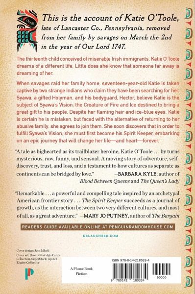 For fans of the Outlander series by Diana Gabaldon, a love story for the ages This is the account of Katie O’Toole, late of Lancaster Co., Pennsylvania, removed from her family by savages on March the 2nd in the year of our Lord 1747.The thirteenth child conceived of miserable Irish exiles, Katie O’Toole dreams of a different life. Little does she know that someone far away is dreaming of her. In 1747, savages raid her family home, and seventeen-year-old Katie is taken captive. Syawa and Hector have been searching for her, guided by Syawa’s dreams. A young Holyman, Syawa believes Katie is the subject of his Vision: the Creature of Fire and Ice, destined to bring a great gift to his people. Despite her flaming hair and ice-blue eyes, Katie is certain he is mistaken, but faced with returning to her family, she agrees to join them. She soon discovers that in order to fulfill Syawa’s Vision, she must first become his Spirit Keeper, embarking on an epic journey that will change her life—and heart—forever. Ideal for fans of The Son and Empire of the Summer Moon, this riveting novel will transport and enchant readers.