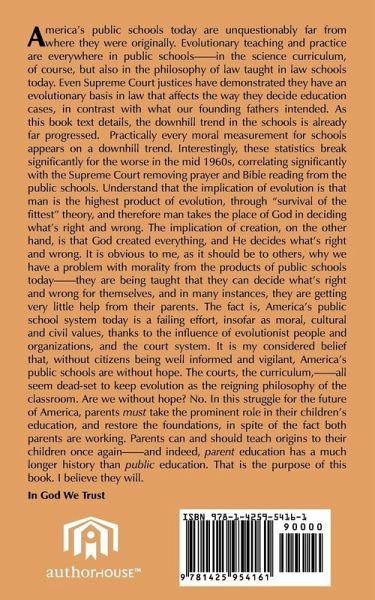 America's public schools today are unquestionably far from where they were originally. Evolutionary teaching and practice are everywhere in public schools--in the science curriculum, of course, but also in the philosophy of law taught in law schools today. Even Supreme Court justices have demonstrated they have an evolutionary basis in law that affects the way they decide education cases, in contrast with what our founding fathers intended. As this book text details, the downhill trend in the schools is already far progressed. Practically every moral measurement for schools appears on a downhill trend. Interestingly, these statistics break significantly for the worse in the mid 1960s, correlating significantly with the Supreme Court removing prayer and Bible reading from the public schools. Understand that the implication of evolution is that man is the highest product of evolution, through "survival of the fittest" theory, and therefore man takes the place of God in deciding what's right and wrong. The implication of creation, on the other hand, is that God created everything, and He decides what's right and wrong. It is obvious to me, as it should be to others, why we have a problem with morality from the products of public schools today--they are being taught that they can decide what's right and wrong for themselves, and in many instances, they are getting very little help from their parents. The fact is, America's public school system today is a failing effort, insofar as moral, cultural and civil values, thanks to the influence of evolutionist people and organizations, and the court system. It is my considered belief that, without citizens being well informed and vigilant, America's public schools are without hope. The courts, the curriculum,--all seem dead-set to keep evolution as the reigning philosophy of the classroom. Are we without hope? No. In this struggle for the future of America, parents must take the prominent role in their children's education