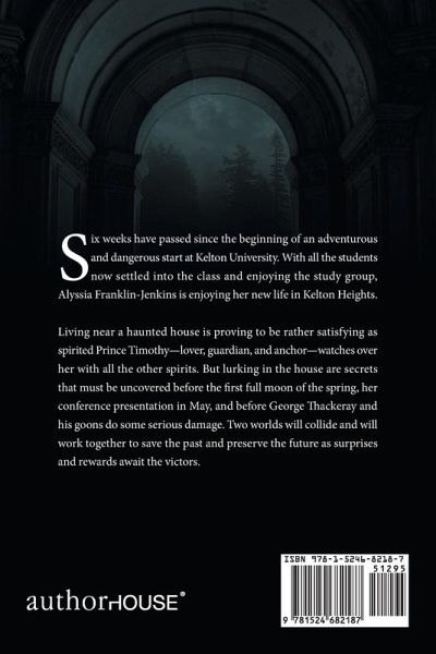 Six weeks have passed since the beginning of an adventurous and dangerous start at Kelton University. With all the students now settled into the class and enjoying the study group, Alyssia Franklin-Jenkins is enjoying her new life in Kelton Heights. Living near a haunted house is proving to be rather satisfying as spirited Prince Timothy—lover, guardian, and anchor—watches over her with all the other spirits. But lurking in the house are secrets that must be uncovered before the first full moon of the spring, her conference presentation in May, and before George Thackeray and his goons do some serious damage. Two worlds will collide and will work together to save the past and preserve the future as surprises and rewards await the victors.
