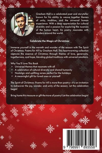 In The Spirit of Christmas: Poems for All, Gresham brings his unique voice to the holiday season, capturing its magic through a blend of classical and contemporary poetic styles. His work transcends geographical boundaries, offering readers a heartfelt journey that highlights the shared emotions of love, joy, hope, and togetherness during this special time of year. Gresham's previous collections have been praised for their emotional depth and vivid imagery. His poems often serve as a bridge between different cultures, emphasizing common values and fostering a sense of global community. He believes in the power of poetry to unite people and inspire positive change. When he's not writing, Gresham Hall enjoys hosting poetry workshops, participating in cultural festivals, and spending time with his family during their own cherished holiday traditions. He continues to travel extensively, always seeking new stories to tell and new voices to bring into his work. Gresham currently resides in a quaint village surrounded by nature's beauty, which often serves as inspiration for his writing. The Spirit of Christmas: Poems for All is a testament to his lifelong dedication to celebrating the human spirit and the joys that connect us all.