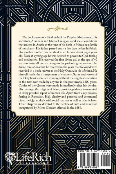 The book presents a life sketch of the Prophet Muhammad, his ancestors, Abraham and Ishmael, religious and social conditions that existed in Arabia at the time of his birth in Mecca in a family of merchants. His father passed away a few days before his birth. His mother mother mother died when he was about eight years old. Even at a young age he was devoted to prayers to God, fasting and meditation. He received the first divine call at the age of 40 years to invite all human beings to the path of righteousness. The divine revelations that he received in the years that followed were recorded in a book known as the Holy Quran, in his life time. He himself made the arrangement of chapters, Suras and verses of the Holy book as we see it today, without the slightest alteration in the text ever made by anyone in the past nearly 1500 years. Copies of the Quran were made immediately after his demise. His message, the religion of Islam, provides guidance to mankind in every possible aspect of human life. Apart from daily prayers, fasting in Ramadan, Hajj, charity and personal and communal piety, the Quran deals with social matters as well as Islamic laws. Three chapters are devoted to the decline of faith and its revival inaugurated by Mirza Ghulam Ahmad in the 1889.