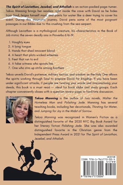 Tekoa Manning brings her readers right inside the cave with David as he hides from Saul, feigns himself mad, and pants for water like a deer trying to cover his scent. During this traumatic journey, David pens some of the most poignant passages in our Bibles due to this crushing from the sea serpent. Although Leviathan is a mythological creature, his characteristics in the Book of Job mimic the seven deadly sins in Proverbs 6:16-19. Haughty eyes A lying tongue Hands that shed innocent blood A heart that plots wicked schemes Feet that run to evil A false witness who spouts lies One who stirs up strife among brothers Tekoa unveils David's patience, military tactics, and wisdom as the Holy One allows the spirits working through Saul to prepare David for kingship. If you have been under significant attacks, if people are twisting your words and misconstruing your deeds, this book is a must read -- ideal for book clubs and study groups. Each chapter conveniently closes with a question review page to facilitate discussion.