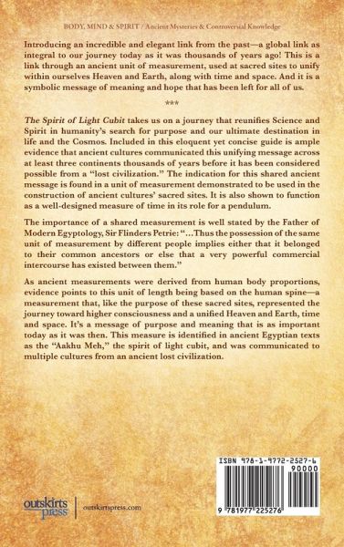 The Spirit of Light Cubit: The Measure of Humanity and Spirit is a journey that reunifies science and Spirit in our search for purpose in life and in the cosmos. Donald B. Carroll, a firefighter and paramedic who learned on that job that living is about more than the physical, proves the existence of a global-reaching ancient civilization with a key piece of evidence from archeology; that key is an ancient unit of measurement. This unit is found in multiple cultures across continents thousands of years before global communication or travel was thought possible. In this measurement, these ancient societies elegantly united science and spirituality, heaven and earth, time and space seamlessly. The Spirit of Light Cubit is the only book that has discovered and correlated this unit of measurement that is an ultimate symbol of humankind's journey of advancement in civilizations and higher consciousness. Perfect for the person who senses there is much more to life, its purpose, and its meaning than just our physical existence, The Spirit of Light Cubit will interest the seeker who feels that our true journey in life is through our consciousness. You are not alone-since the beginning of humanity, people have understood this, and Carroll now proves it.