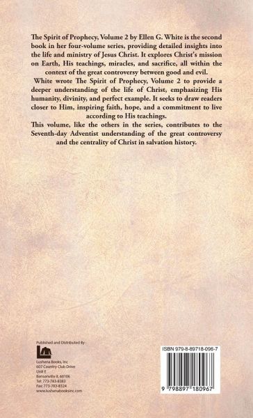 The Spirit of Prophecy, Volume 2 by Ellen G. White is the second book in her four-volume series, providing detailed insights into the life and ministry of Jesus Christ. It explores Christ's mission on Earth, His teachings, miracles, and sacrifice, all within the context of the great controversy between good and evil. White wrote The Spirit of Prophecy, Volume 2 to provide a deeper understanding of the life of Christ, emphasizing His humanity, divinity, and perfect example. It seeks to draw readers closer to Him, inspiring faith, hope, and a commitment to live according to His teachings. This volume, like the others in the series, contributes to the Seventh-day Adventist understanding of the great controversy and the centrality of Christ in salvation history.