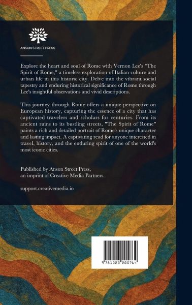 Explore the heart and soul of Rome with Vernon Lee's "The Spirit of Rome," a timeless exploration of Italian culture and urban life in this historic city. Delve into the vibrant social tapestry and enduring historical significance of Rome through Lee's insightful observations and vivid descriptions. This journey through Rome offers a unique perspective on European history, capturing the essence of a city that has captivated travelers and scholars for centuries. From its ancient ruins to its bustling streets, "The Spirit of Rome" paints a rich and detailed portrait of Rome's unique character and lasting impact. A captivating read for anyone interested in travel, history, and the enduring spirit of one of the world's most iconic cities. This work has been selected by scholars as being culturally important, and is part of the knowledge base of civilization as we know it. This work is in the public domain in the United States of America, and possibly other nations. Within the United States, you may freely copy and distribute this work, as no entity (individual or corporate) has a copyright on the body of the work. Scholars believe, and we concur, that this work is important enough to be preserved, reproduced, and made generally available to the public. We appreciate your support of the preservation process, and thank you for being an important part of keeping this knowledge alive and relevant.