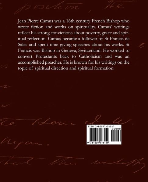 Jean Pierre Camus was a 16th century French Bishop who wrote fiction and works on spirituality. Camus' writings reflect his strong convictions about poverty, grace and spiritual reflection. Camus became a follower of St Francis de Sales and spent time giving speeches about his works. St Francis was Bishop in Geneva, Switzerland. He worked to convert Protestants back to Catholicism and was an accomplished preacher. He is known for his writings on the topic of spiritual direction and spiritual formation.