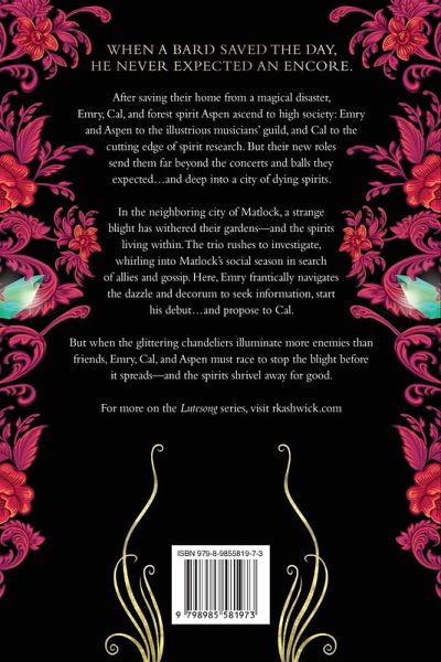 When a bard saved the day, he never expected an encore. After saving their home from a magical disaster, Emry, Cal, and forest spirit Aspen ascend to high society: Emry and Aspen to the illustrious musicians' guild, and Cal to the cutting edge of spirit research. But their new roles send them far beyond the concerts and balls they expected...and deep into a city of dying spirits. In the neighboring city of Matlock, a strange blight has withered their gardens-and the spirits living within. The trio rushes to investigate, whirling into Matlock's social season in search of allies and gossip. Here, Emry frantically navigates the dazzle and decorum to seek information, start his debut...and propose to Cal. But when the glittering chandeliers illuminate more enemies than friends, Emry, Cal, and Aspen must race to stop the blight before it spreads-and the spirits shrivel away for good.