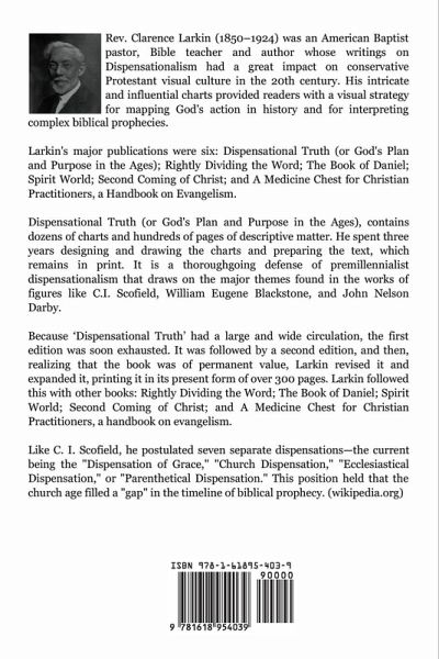 Rev. Clarence Larkin (1850–1924) was an American Baptist pastor, Bible teacher and author whose writings on Dispensationalism had a great impact on conservative Protestant visual culture in the 20th century. His intricate and influential charts provided readers with a visual strategy for mapping God's action in history and for interpreting complex biblical prophecies. Larkin's major publications were six: Dispensational Truth (or God's Plan and Purpose in the Ages); Rightly Dividing the Word; The Book of Daniel; Spirit World; Second Coming of Christ; and A Medicine Chest for Christian Practitioners, a Handbook on Evangelism. Dispensational Truth (or God's Plan and Purpose in the Ages), contains dozens of charts and hundreds of pages of descriptive matter. He spent three years designing and drawing the charts and preparing the text, which remains in print. It is a thoroughgoing defense of premillennialist dispensationalism that draws on the major themes found in the works of figures like C.I. Scofield, William Eugene Blackstone, and John Nelson Darby. Because ‘Dispensational Truth’ had a large and wide circulation, the first edition was soon exhausted. It was followed by a second edition, and then, realizing that the book was of permanent value, Larkin revised it and expanded it, printing it in its present form of over 300 pages. Larkin followed this with other books: Rightly Dividing the Word; The Book of Daniel; Spirit World; Second Coming of Christ; and A Medicine Chest for Christian Practitioners, a handbook on evangelism. Like C. I. Scofield, he postulated seven separate dispensations—the current being the "Dispensation of Grace," "Church Dispensation," "Ecclesiastical Dispensation," or "Parenthetical Dispensation." This position held that the church age filled a "gap" in the timeline of biblical prophecy. (wikipedia.org)
