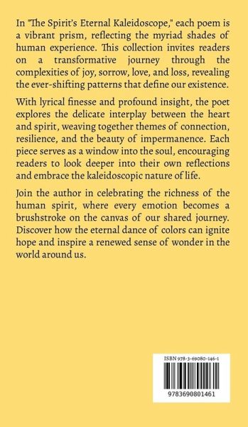 In "The Spirit's Eternal Kaleidoscope," each poem is a vibrant prism, reflecting the myriad shades of human experience. This collection invites readers on a transformative journey through the complexities of joy, sorrow, love, and loss, revealing the ever-shifting patterns that define our existence. With lyrical finesse and profound insight, the poet explores the delicate interplay between the heart and spirit, weaving together themes of connection, resilience, and the beauty of impermanence. Each piece serves as a window into the soul, encouraging readers to look deeper into their own reflections and embrace the kaleidoscopic nature of life. Join the author in celebrating the richness of the human spirit, where every emotion becomes a brushstroke on the canvas of our shared journey. Discover how the eternal dance of colors can ignite hope and inspire a renewed sense of wonder in the world around us.