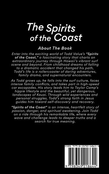 Enter into the exciting world of Todd Value's "Spirits of the Coast," a fascinating story that charts an extraordinary journey through Hawaii's vibrant surf scene and beyond. From childhood dreams of falling to a dramatic accident that changed his path, Todd's life is a rollercoaster of daring adventures, family drama, and supernatural encounters. As Todd grows up, he falls into the surf culture, faces intense family conflicts, and takes part in high-speed car escapades. His story leads him to Taylor Camp's hippie lifestyle and the beautiful, yet dangerous, landscapes of Kauai. Through wild experiences and personal struggles, Todd's strong faith in Jesus guides him toward self-discovery and recovery. "Spirits of the Coast" is an intense, heartfelt story of passion, danger, and spiritual awakening. Join Todd on a ride through his remarkable life, where every wave and challenge leads to deeper truths and a search for true meaning.