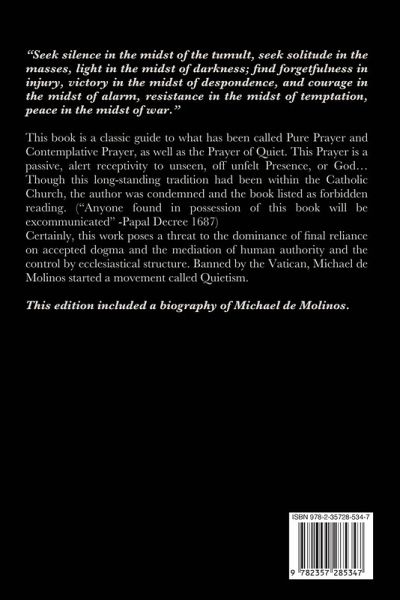 "Seek silence in the midst of the tumult, seek solitude in the masses, light in the midst of darkness; find forgetfulness in injury, victory in the midst of despondence, and courage in the midst of alarm, resistance in the midst of temptation, peace in the midst of war."This book is a classic guide to what has been called Pure Prayer and Contemplative Prayer, as well as the Prayer of Quiet. This Prayer is a passive, alert receptivity to unseen, off unfelt Presence, or God... Though this long-standing tradition had been within the Catholic Church, the author was condemned and the book listed as forbidden reading. ("Anyone found in possession of this book will be excommunicated" -Papal Decree 1687)Certainly, this work poses a threat to the dominance of final reliance on accepted dogma and the mediation of human authority and the control by ecclesiastical structure.Banned by the Vatican, Michael de Molinos started a movement called Quietism. This edition included a biography of Michael de Molinos.