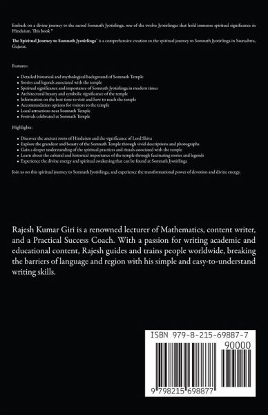 Embark on a divine journey to the sacred Somnath Jyotirlinga, one of the twelve Jyotirlingas that hold immense spiritual significance in Hinduism. This book " The Spiritual Journey to Somnath Jyotirlinga" is a comprehensive creation to the spiritual journey to Somnath Jyotirlinga in Saurashtra, Gujarat. Features:Detailed historical and mythological background of Somnath Temple Stories and legends associated with the temple Spiritual significance and importance of Somnath Jyotirlinga in modern times Architectural beauty and symbolic significance of the temple Information on the best time to visit and how to reach the temple Accommodation options for visitors to the temple Local attractions near Somnath Temple Festivals celebrated at Somnath Temple Highlights:Discover the ancient roots of Hinduism and the significance of Lord Shiva Explore the grandeur and beauty of the Somnath Temple through vivid descriptions and photographs Gain a deeper understanding of the spiritual practices and rituals associated with the temple Learn about the cultural and historical importance of the temple through fascinating stories and legends Experience the divine energy and spiritual awakening that can be found at Somnath Jyotirlinga Join us on this spiritual journey to Somnath Jyotirlinga, and experience the transformational power of devotion and divine energy.